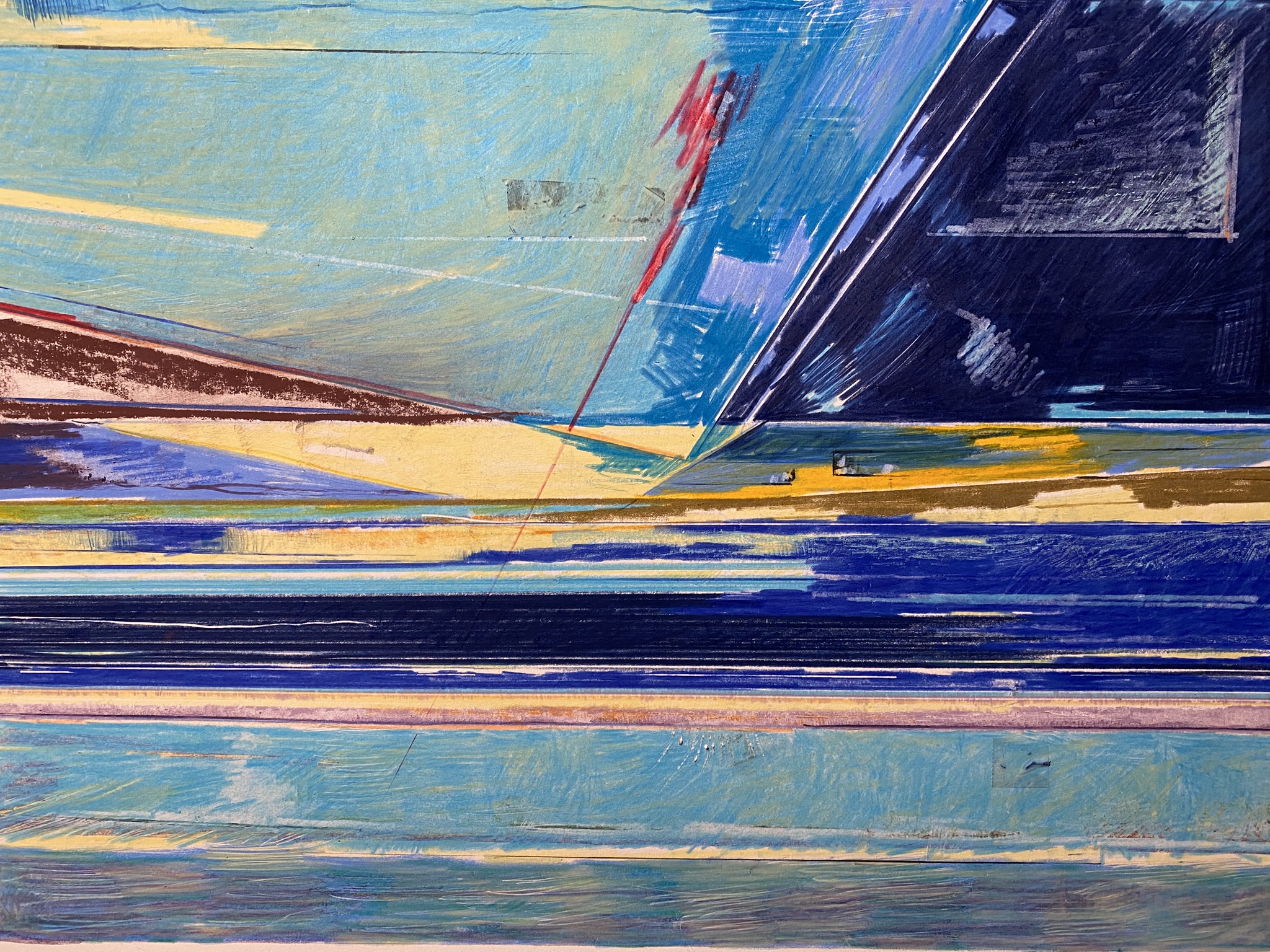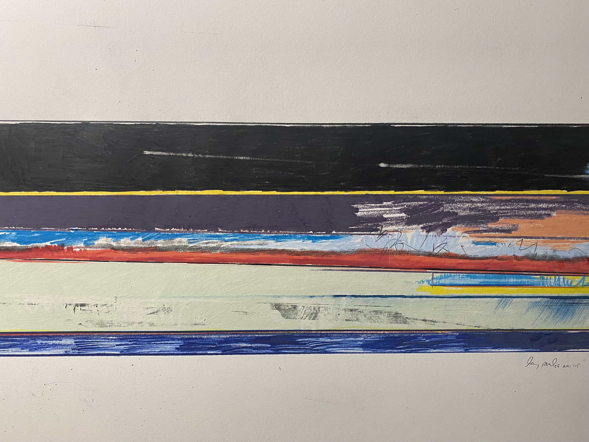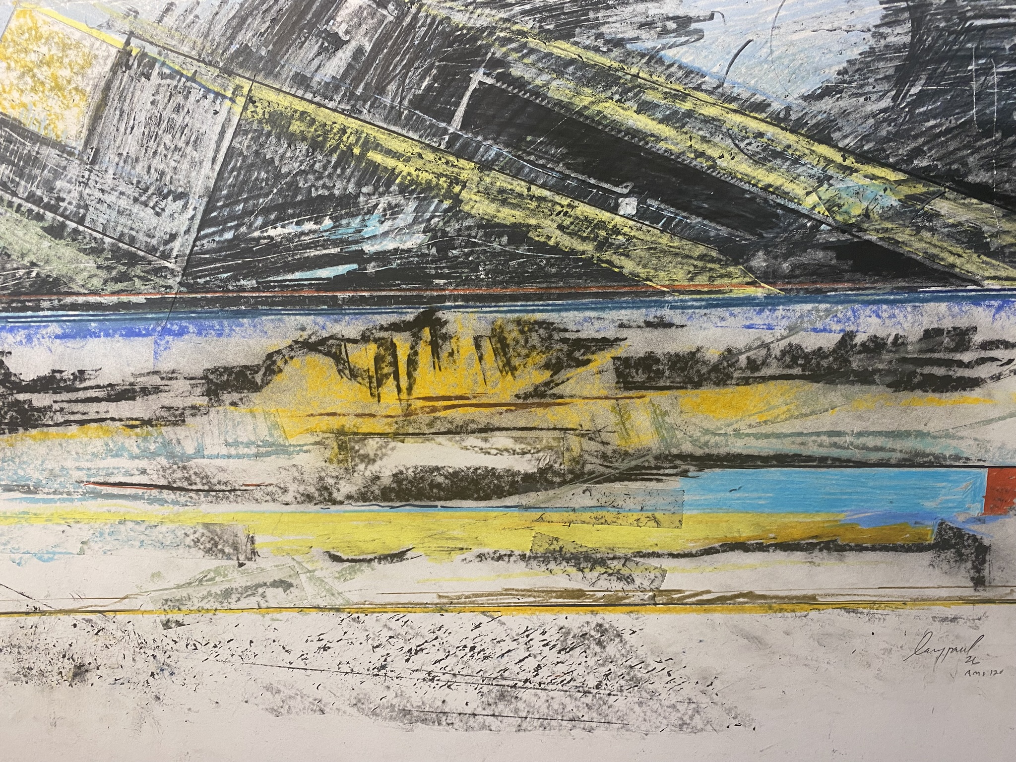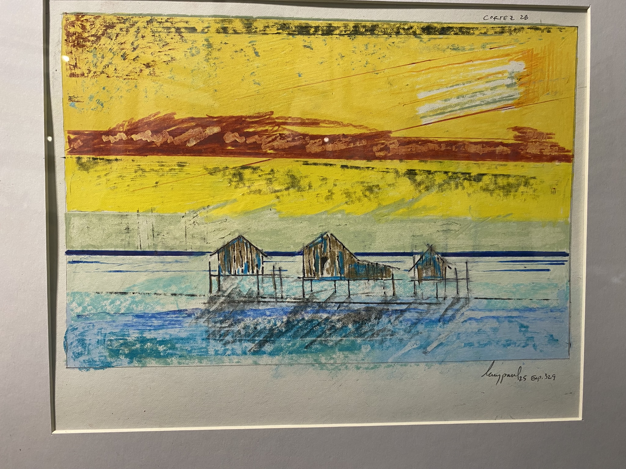 Personal, yet open and outwardly expressive, the Sunsets series presents an abstract expressionistic quality with an overlapping and abutting color technique that contrasts and brings the movements together at the same time. The typical colors are easily inspired by a wild brilliance offered by the mix of sunsets, storms, and open blue and green water. There is a rather “angry” application method in creating these artworks as noted in some frenzy of the pencil strokes, yet anger and calm can be appreciated together. The beauty of a fishing village often combines its aged infrastructure with the beauty and color of sunsets and the water vessels that are found within them in what becomes a creatively expressed scene or seascape.