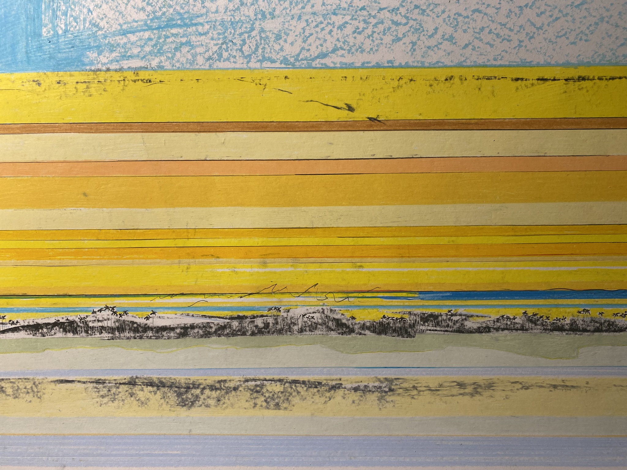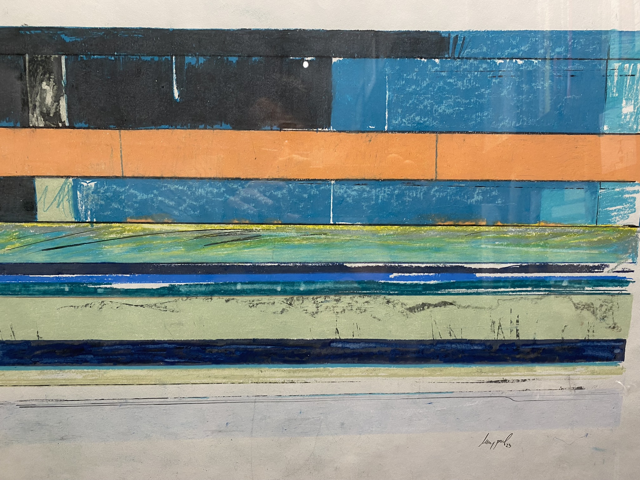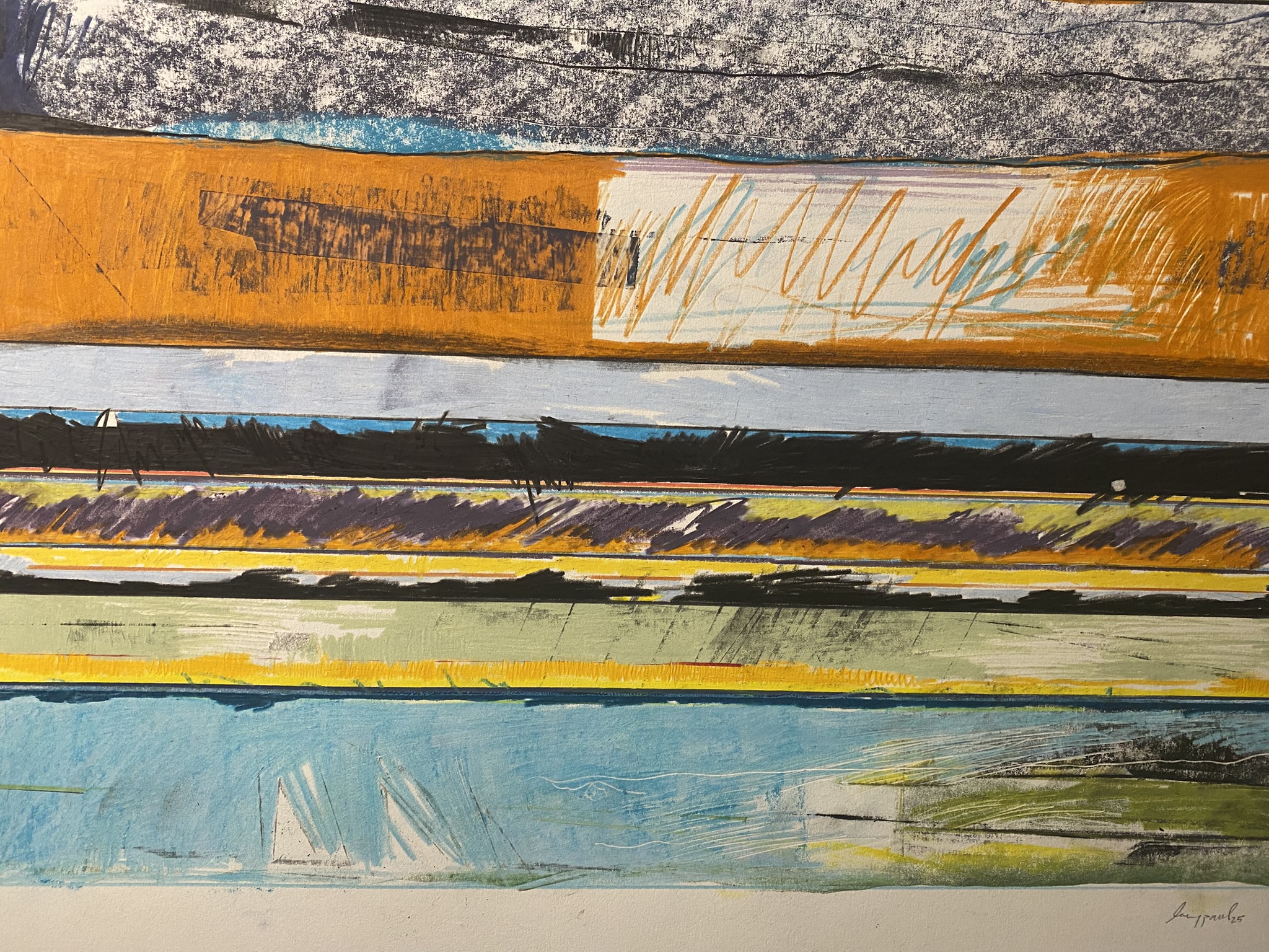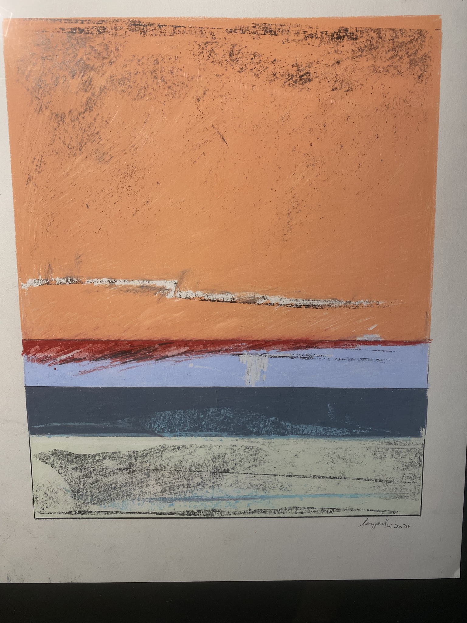 Personal, yet open and outwardly expressive, the Sunsets series presents an abstract expressionistic quality with an overlapping and abutting color technique that contrasts and brings the movements together at the same time. The typical colors are easily inspired by a wild brilliance offered by the mix of sunsets, storms, and open blue and green water. There is a rather “angry” application method in creating these artworks as noted in some frenzy of the pencil strokes, yet anger and calm can be appreciated together. The beauty of a fishing village often combines its aged infrastructure with the beauty and color of sunsets and the water vessels that are found within them in what becomes a creatively expressed scene or seascape.